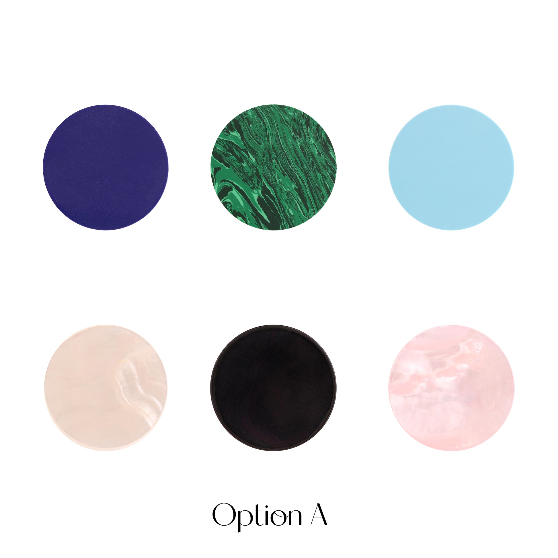 Option A: Lapis lazuli, Turquoise, Malachite, Black mother of pearl, White mother of Pearl, Pink mother of pearl.