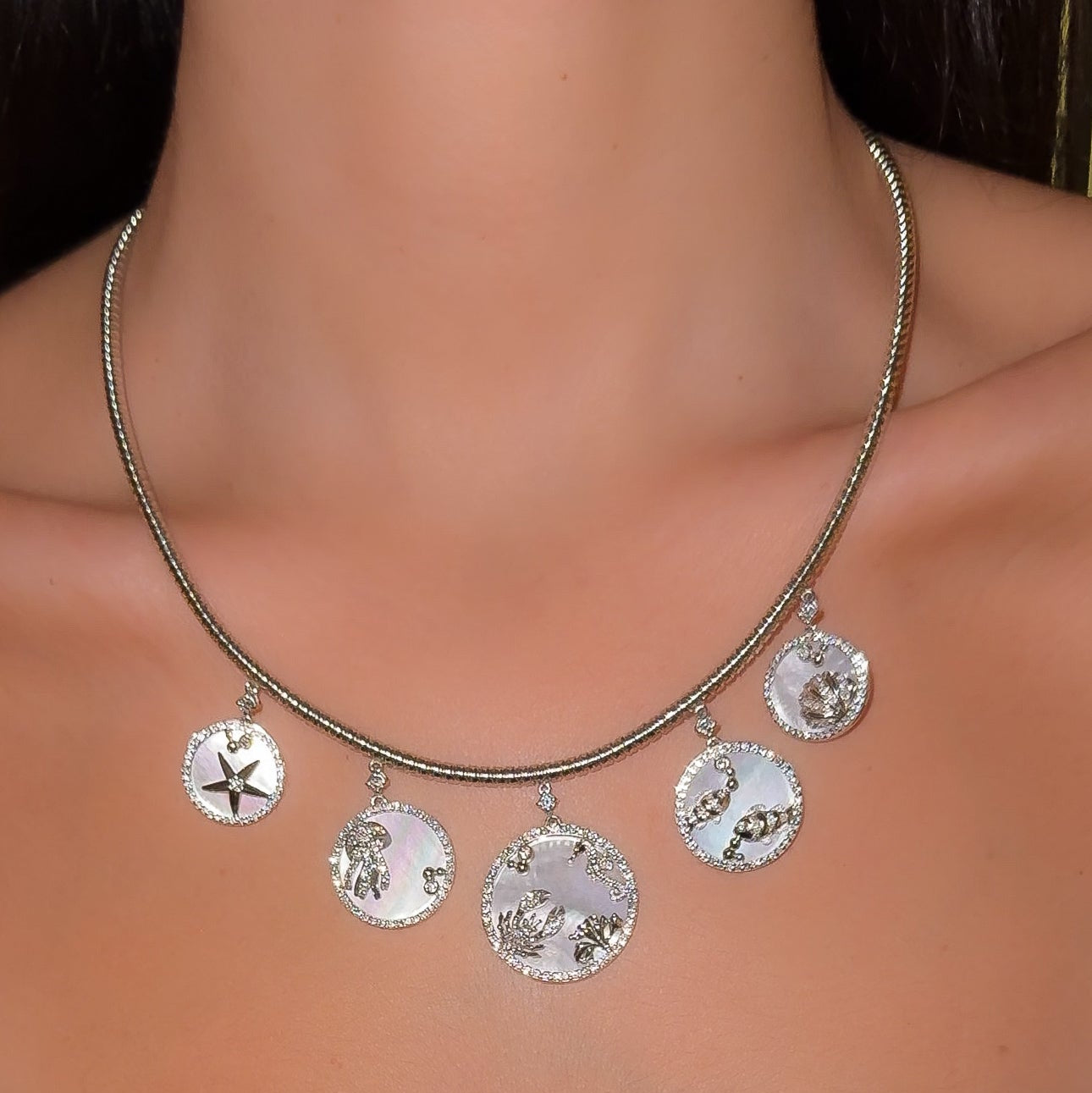 All pendants come with 12 interchangeable backplates: Lapis lazuli, Turquoise, Malachite, Black mother of pearl, White mother of Pearl, Pink mother of pearl, Light blue mother of pearl, Blue mother of pearl, Green mother of pearl, Red coral, Red mother of pearl, Purple mother of pearl.